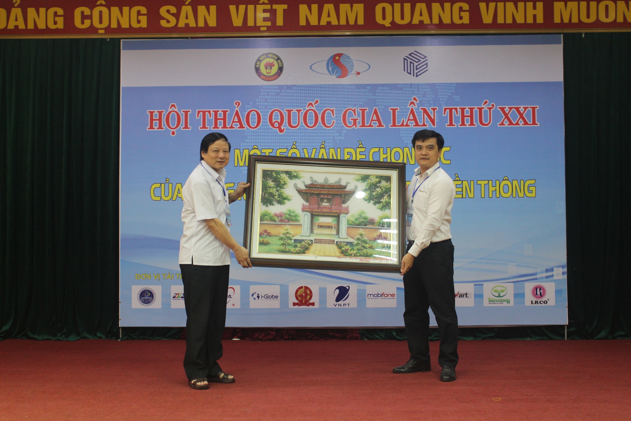 TS Nguyễn Trường Thắng và PGS. TS Nguyễn Mạnh An chứng kiến việc chuyển giao cờ luân lưu Hội thảo @ giữa 2 Trưởng Khoa CNTT Trường Đại học Hồng Đức và Trường Đại học Thái Bình - đơn vị đăng cai tổ chức @ XXII năm 2019.